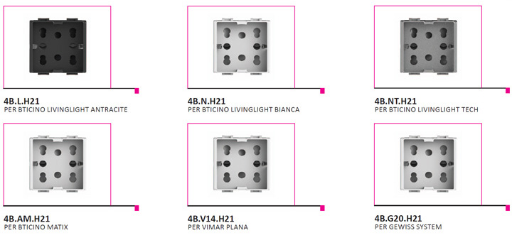 Una presa SchuKo occupa due moduli: se occorre alimentare un apparecchio con spina da 16 A si deve far uso di una multipresa oppure (se c’è ancora spazio disponibile nella scatola da incasso) si deve aggiungere il frutto necessario al punto luce. Viceversa, per usare una spina SchuKo con un punto luce equipaggiato con prese di tipo 10/16 A serve un adattatore. Con Side, invece, gli adattatori (che spesso non si trovano…) diventano oggetti del passato e si risolvono tante piccole inefficienze quotidiane.