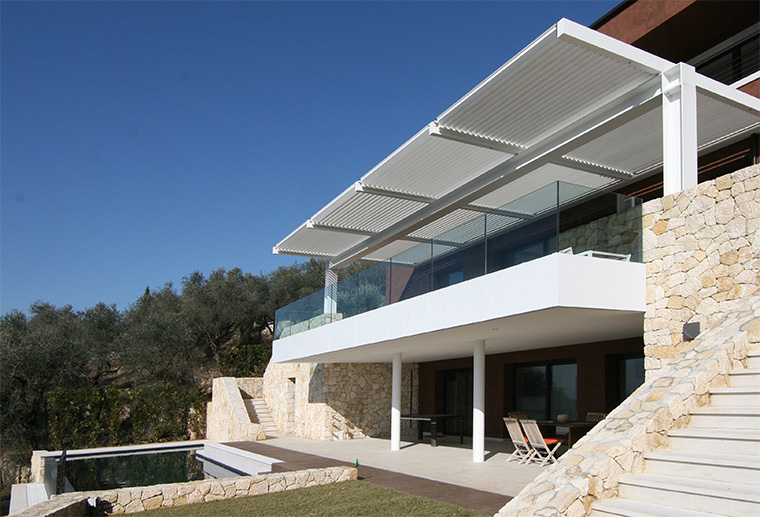 La movimentazione da 0° a 90°, è sempre motorizzata, con comando a pulsante o telecomando a radiofrequenza e la possibilità di montare un sensore pioggia per la chiusura automatica della copertura in caso di pioggia improvvisa.
