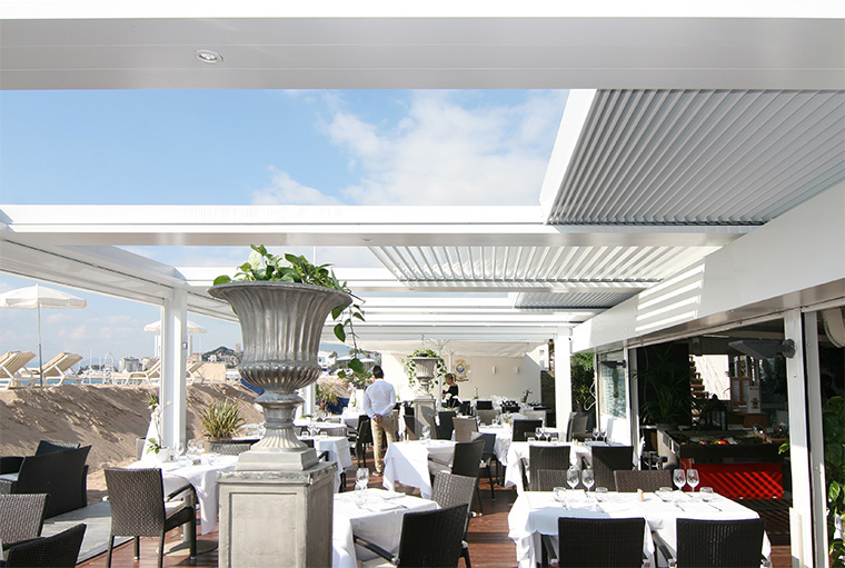 Il sistema può essere completato con chiusure laterali in vetro scorrevoli o impacchettabili, tende a zip trasparenti e sistemi integrati di illuminazione.