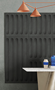 La boiserie a rilievo Groove sviluppata in collaborazione con lo studio Lucchesedesign e la nuova carta da parati Raw ispirata ai tessuti grezzi