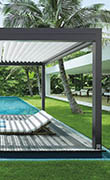 Disponibile in versione a isola o addossata, la pergola Twist consente di gestire il flusso d’aria e la luce diretta grazie alla copertura a lame orientabili