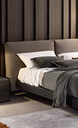 L'essenzialità della struttura in legno dialoga con le forme morbide della testiera imbottita leggermente inclinata
