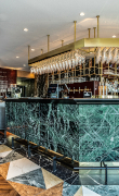 Il rivestimento tridimensionale in marmo TARTAN Verde Tinos scelto per la parete del banco bar