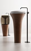 La collezione di lavabi e complementi bagno firmata Enzo Berti combina elementi realizzati in vetro di Murano e cotto toscano