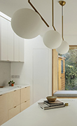 Le superfici in pietra acrilica definiscono i piani di lavoro e la grande isola centrale, così come il lavello integrato nel top
