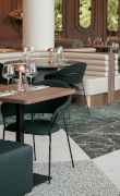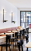 Le sfere firmate Antoni Arola dialogano con gli arredi in legno e le finiture in marmo: la panetteria Rustica Sourdoug a cura di Fiona Drago