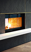 Ecosostenibile e tecnologico, il caminetto Palazzetti integra una nuova panca in marmo bianco levigato