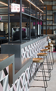 Il rivestimento progettato per il bancone e il bar della reception riprende graficamente le tradizionali piastrelle portoghesi
