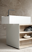 Un volume monolitico include un lavabo dalle forme rigorose e un contenitore funzionale
