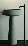 L'iconica vasca free-standing Spoon XL e il lavabo a colonna Bjhon 2 realizzati con Pietranova, l’agglomerato di Pietra di Vicenza ricavato dal riciclo degli scarti di lavorazione