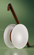 Delfo combina linee scultoree e forme morbide, in un gioco di contrasti tra ceramica e legno