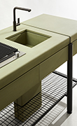Un'isola compatta in cemento colorato ispirata all'architettura modernista della metà del XX secolo