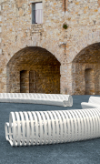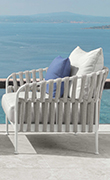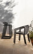 Tavolini, sedie, sgabelli e lettini prendisole reinterpretano l’atmosfera conviviale della tradizione mediterranea