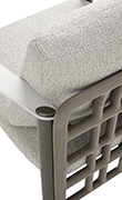 Sedute, divani e tavoli sono definiti da una struttura in legno dalle linee morbide e asimmetriche