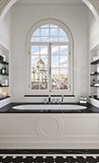 Il gioco di contrasti tra il bianco e il nero definisce lo stile della stanza, affacciata nel centro storico della capitale russa