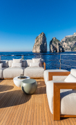 Divano modulare, poltrona e pouf Claud insieme ai tavoli bassi Bongo arredano la Sun Lounge
