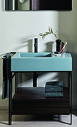 Pensato per piccoli spazi, il lavabo in ceramica colorata include piani d'appoggio, accessori e cassetti