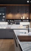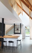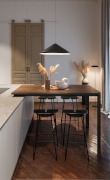 Una grande isola cucina in Solid Surface dialoga con spazi d'ispirazione rurale