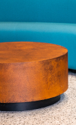 La collezione effetto corten Oxydecor® riveste mensole, tavolini e bancone reception