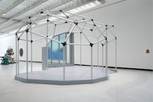 Una nuova opera site specific prodotta per la mostra al MAXXI, Ocean Pavilion, costituisce parte del lavoro di ricerca di Oscar Tuazon effettuato sull’acqua quale mezzo di conduzione e materiale scultoreo. La facciata a cascata suggerisce che le questioni pragmatiche di conservazione dell’energia e circolazione dell’acqua possono lasciare il posto a visioni futuristiche. La finestra d’acqua funge da lente, un dispositivo ottico che ci permette di vedere il mondo attraverso uno strato liquido. Questa cascata perpetua è accolta in un esoscheletro di alluminio e nodi ottenuti mediante stampa in 3D, che ricreano un padiglione visto come dispositivo fisico e attivatore di coscienza. È un luogo in cui interrogarsi sul posto che occupiamo nel mondo naturale e il nostro rapporto con l’acqua, elemento da cui dipendono le nostre vite.