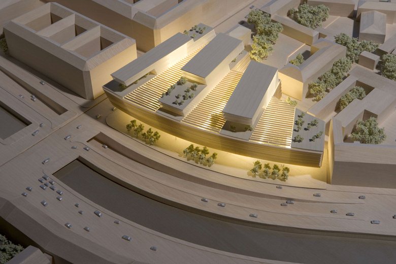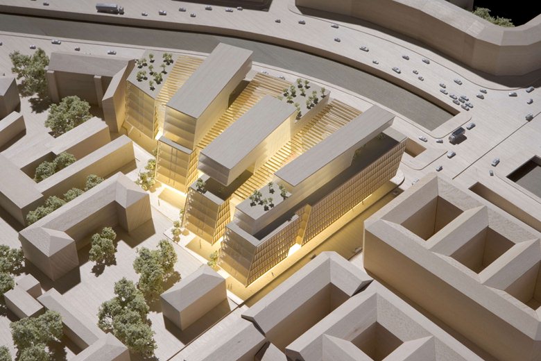 Quattro edifici si estendono da nord a sud beneficiando all’interno della massima luce solare durante il giorno. Ampi atri immaginati tra i quattro edifici danno forma a piazze pubbliche al coperto, luoghi di ritrovo per tutto l’anno. Al pian terreno trovano spazio negozi e caffetterie.