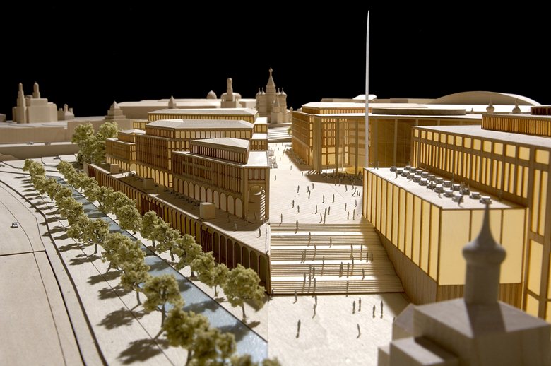 In tale ottica il maggiore sforzo progettuale sarebbe piuttosto consistito nel progetto urbano, ed in particolare nel ripristino di porzioni del reticolato stradale rimosse negli anni ‘60 per la costruzione dell’Hotel Rossiya.