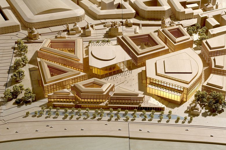 Dei colonnati segnano le strade principali, che si incontrano in una piazza centrale sulla quale si affacciano una sala concerti multifunzionale, una sala filarmonica, un museo, un teatro ed una sala banchetti.