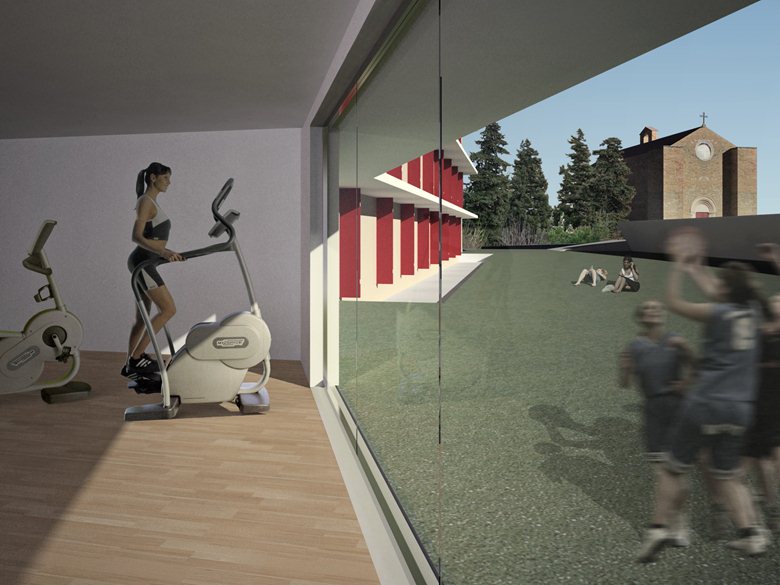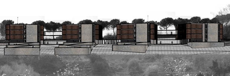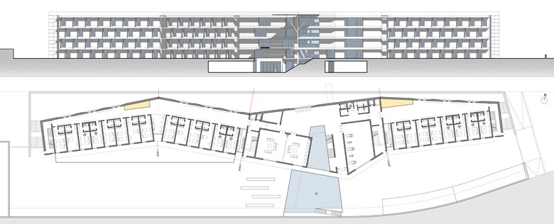 Il progetto nasce dal rapporto tra costruzione e strada, ponendosi come fronte e blocco unico sul confine nord del lotto parallelo alla strada su cui si affacciano, verso sud, gli alloggi della residenza universitaria.