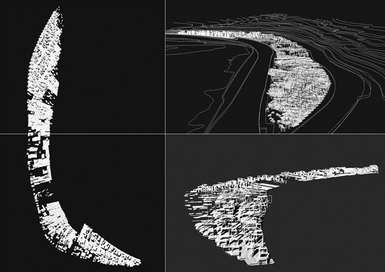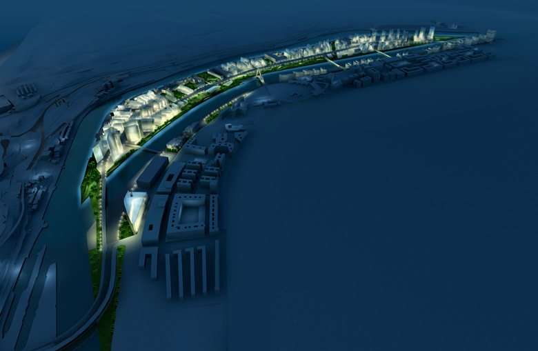 Un elegante sistema di blocchi di edifici disegna lo skyline e la pianta dell’area. Paragonabili ad una serie di “mattonelle”, ciascuna di oltre 1000 metri quadrati, questi blocchi risultano allineati secondo l’andamento curvilineo del fiume.
