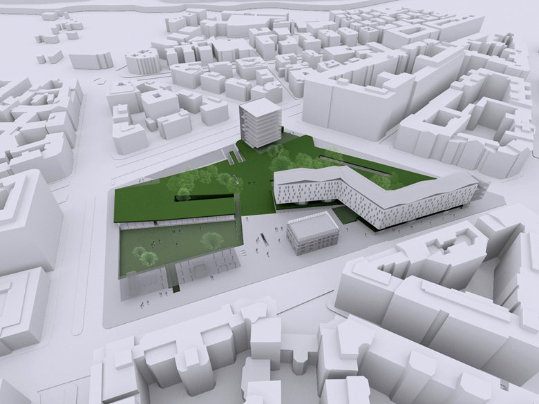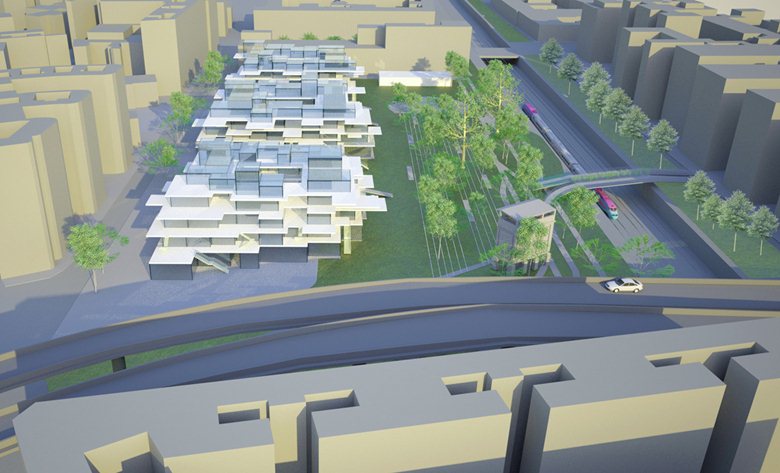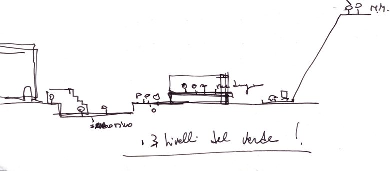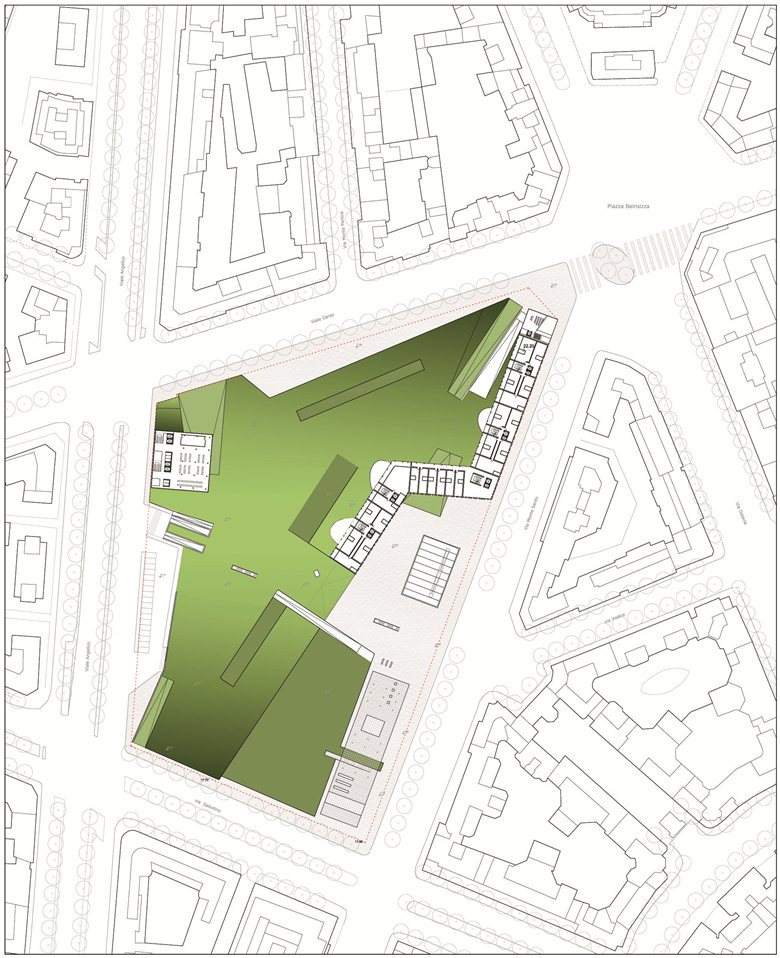 parco - realizzazione di un suolo verde continuo che si muove in sezione dalla quota stradale a quella del primo piano degli edifici residenziale e degli uffici e che raccorda tutti i fronti stradali con percorsi liberi e accessibili. Il parco si incunea anche sotto il volume delle due costruzioni, costruendo quindi una relazione diretta tra case, uffici e parco;