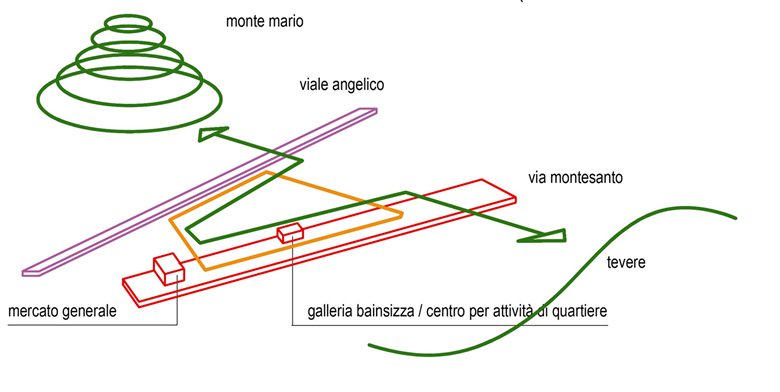 “Il progetto propone una strategia articolata, che ridefinisce l’isolato attraverso una serie di elementi capaci di generare un nuovo e convincente assetto urbano. Un nuovo giardino in pendenza nasconde i parcheggi e sostiene le varie funzioni pubbliche e private. Su viale Carso un arretramento del margine determina un nuovo parterre per bar e ristoranti, mentre su via Monte Santo il basamento è destinato a commercio di vicinato. Due corpi alti, uno in linea che segue via Monte Santo a destinazione residenziale e ricettiva e uno a destinazione mista sull’angolo tra viale Carso e viale Angelico ridefiniscono i margini del lotto ATAC senza chiuder lo al la città. Su via Monte Santo la conservazione di un edificio esistente destinato a servizi pubblici genera l’occasione di una piccola piazza in fregio alla strada aperta verso la porzione di giardino prevista per l’area ATAC. La chiarezza dell’impianto proposto e l’articolazione delle soluzioni spaziali possono guidare un processo di trasformazione passibile dei necessari aggiustamenti che la situazione richiede senza perdere forza urbana.”