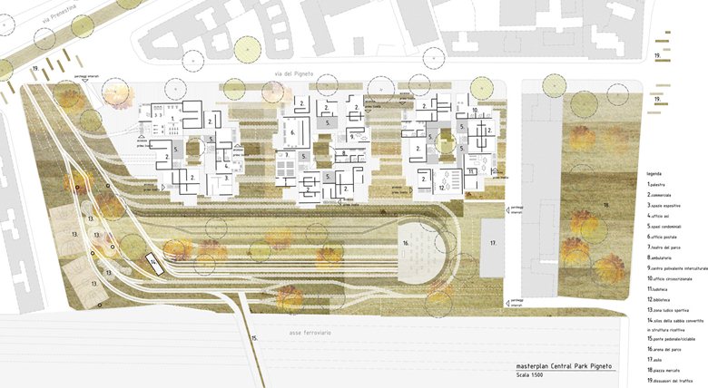 “La condizione difficile del sito e la presenza dei forti condizionamenti dati dalla ferrovia e dal la tangenziale richiede una strategia chiara ma flessibile, che sappia accogliere le richieste di permeabilità dello spazio pubblico riconoscendo via del Pigneto come asse strutturante del quartiere. Il progetto vincitore propone un nuovo e convincente assetto urbano fatto di pochi e semplici elementi. Un margine edilizio “poroso” ridefinisce la strada, articolando lo spazio pubblico verso un grande giardino adagiato tra la strada e la ferrovia che usa le tracce dei binari come elementi di disegno del verde. I tre volumi proposti lungo via del Pigneto configurano una tipologia semplice e innovativa, che coniuga la memoria storica delle corti del quartiere con le nuove esigenze di sostenibilità ambientale dell’abitare urbano. Nei basamenti le attività collettive assicurano la vitalità del la strada e del nuovo giardino a tutte le ore del giorno, mentre un sovrappasso pedonale sopra i binari assicura la continuità con il tessuto urbano a sud”.