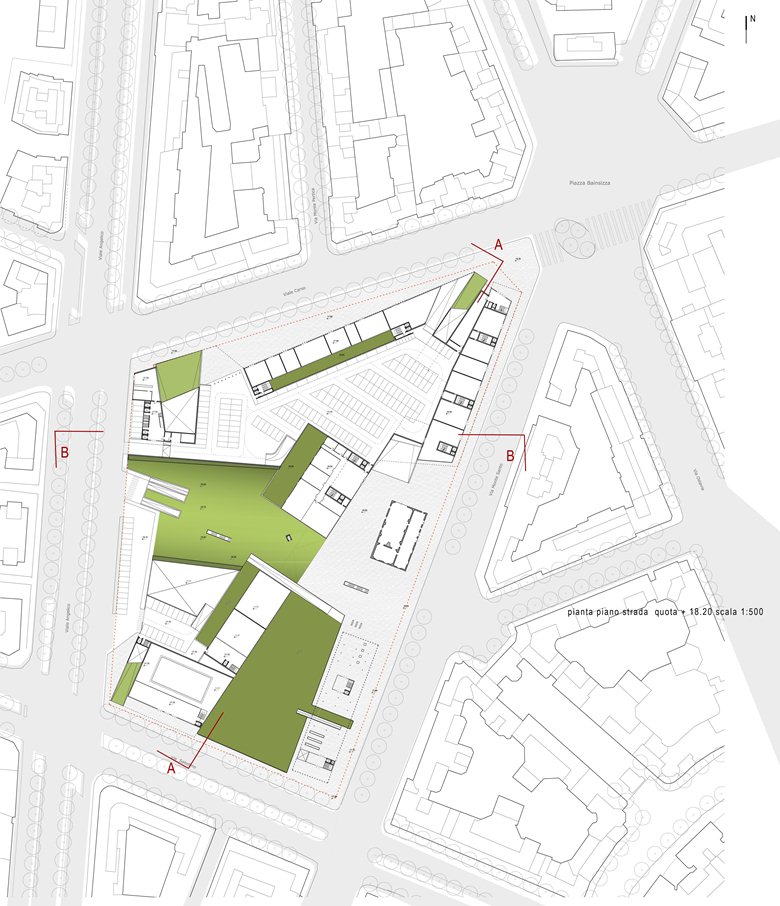 Il progetto vincitore consiste nell’aver prima costruito per il lotto, inteso nella sua accezione più ampia, una regola basata sulla presenza si una grande spazio verde attraversabile in tutte le direzioni. Poi si è organizzato un programma edilizio discreto, in grado da un lato di soddisfare le richieste e le prescrizioni del bando e dall’altro di disegnare relazioni immediate con quanto oggi già “disegna” la vita del quartiere.