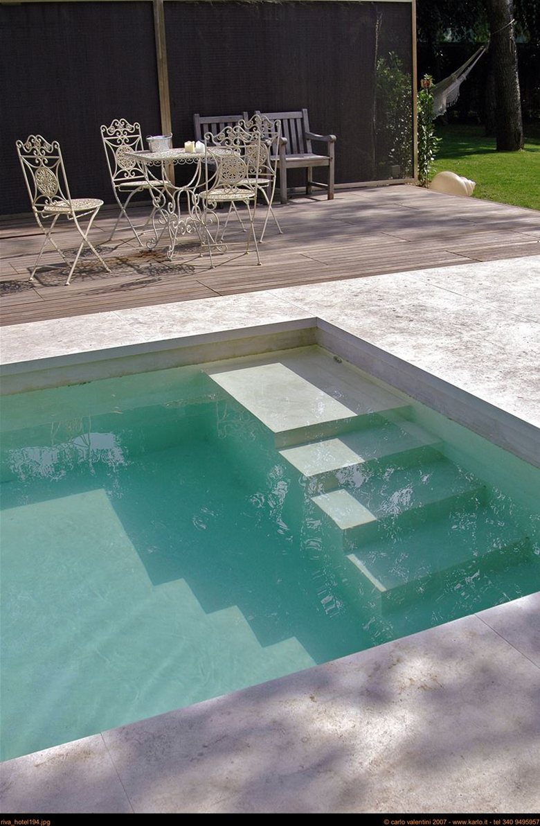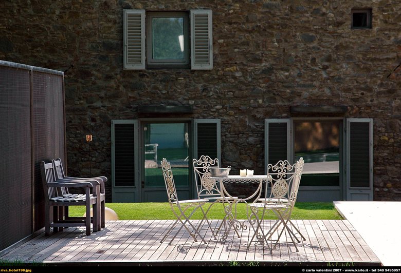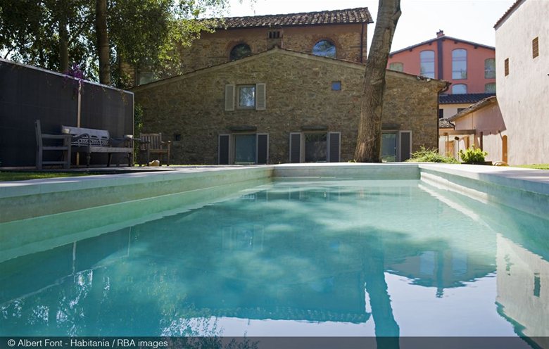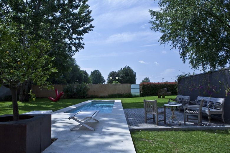 Il verde della campagna toscana disegna il giardino del Riva Lofts da cui si aprono scorci suggestivi sul Parco delle Cascine. La vasca, interamente in pietra arenaria, é caratterizzata da forme regolari e geometriche che, unite alla nitidezza del materiale, le attribuiscono un carattere quasi metafisico.