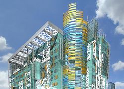 Il rivestimento serigrafato che disegna superfici ora con balconi ora di facciata ancor più la “magia” che il plesso esprime e che offre suggestione sia di giorno che di sera/notte.