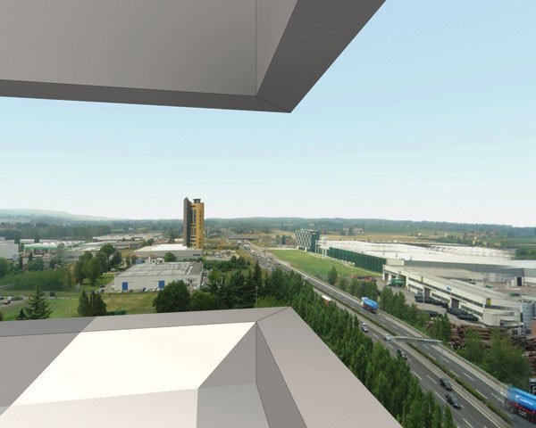 L’edificio “a torre” è caratterizzato esternamente da un involucro vetrato bicolore ed è organizzato su 14 livelli; 13 piani fuori terra ad uso direzionale di cui il piano terra con potenziale ammezzato e 1 piano interrato trasformabile ad uso ufficio, sala riunione o altro, per una superficie commerciale complessiva di circa 5.000 mq.