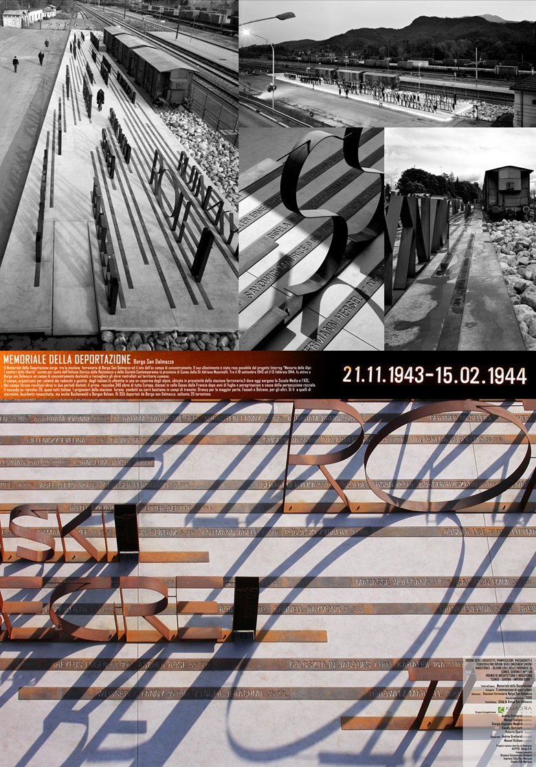 Per la categoria E - Sistemazioni di Spazi Urbani vincono gli architetti Manuel Giuliano e Andrea Grottaroli (Studio Quadra) con Memoriale della deportazione, opera realizzata per la stazione di Borgo San Dalmazzo, “per l’interpretazione senza retorica di un tema alto e difficile e la capacità di inserire nella vita che scorre un elemento della memoria”. Memoriale della deportazione si inserisce nel progetto interregionale I sentieri della memoria a cura dell’Istituto Storico della Resistenza per ricordare il campo di concentramento allestito a Borgo San Dalmazzo tra il ’43 e il ’44, destinato a raccogliere gli ebrei rastrellati sul territorio cuneese in attesa del loro trasferimento ai campi di sterminio di Auschwitz e Mathausen. L’installazione trasforma un binario morto e un vagone abbandonato in un racconto fatto di nomi e date, di vite spezzate e di viaggi senza ritorno per rinnovare la memoria di questo luogo che porta impresso il passaggio di un periodo intenso della storia locale.