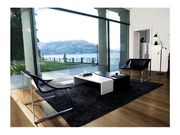 Convivono due anime in Cernobbio: il rigore della struttura e la forma sinuosa della scocca che eccelle per il rivestimento in cuoietto. La prima è costituita da un tubo ellittico di acciaio cromato che crea gambe a slitta squadrate, basse quelle anteriori, alte fino all’apice dello schienale quelle posteriori. La scocca è in multistrato, rivestito in cuoietto stampato coccodrillo bianco, oppure in pelle fiore sauvage stampato giglio. Il modello è versatile nella destinazione: adatto sia alla zona notte che a quella giorno.