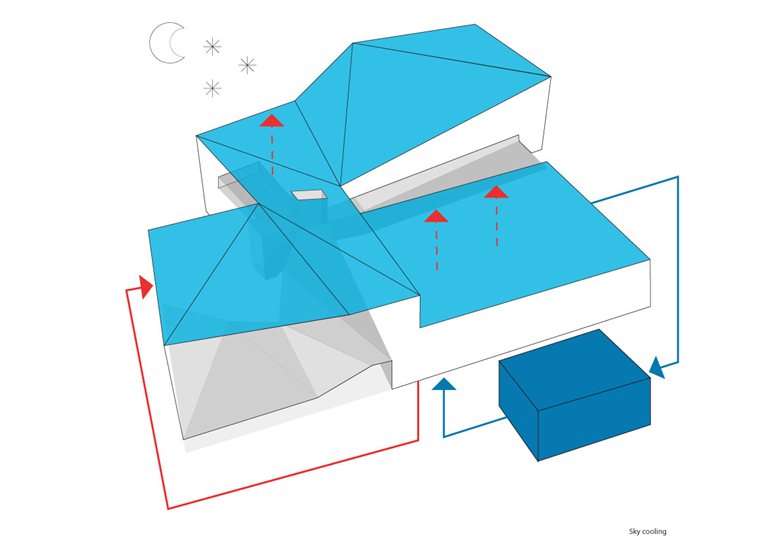 Uno strato di “gusci intelligenti” copre in parte l'esterno della struttura in calcestruzzo. Questi gusci proteggono la costruzione dal sole e consentono, nonostante le grandi aperture, di mantenere l'interno fresco e ombreggiato. I gusci riflettenti contengono, in parte, una nuova generazione di pannelli solari fotovoltaici.