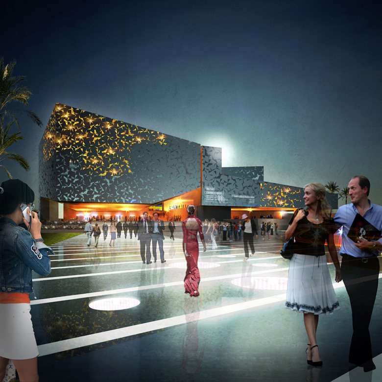 L'ingresso principale è soprelevato rispetto al piano stradale e si apre verso la città e verso la passeggiata a mare; accoglie i visitatori e mostra l’interno ricco di attività. Il parco cittadino è parte integrante della piazza di accesso che conduce alla "red carpet area" e alla grande hall.