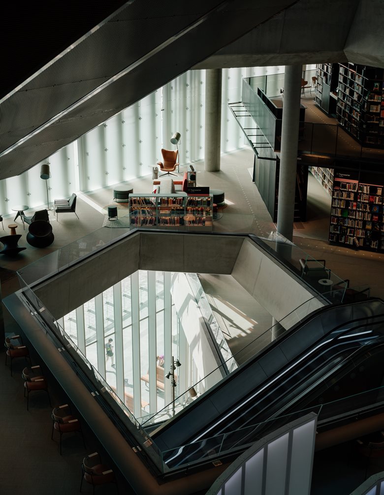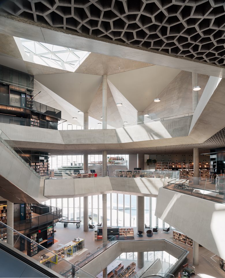 Gli interni della struttura sono organizzati attorno a uno spazio vuoto centrale, che principia dal tetto in vetro e si sviluppa fino al pian terreno, consentendo alla luce solare di penetrare al cuore dell’edificio, creando un’atmosfera calda e rilassante su tutti e quattro i piani della biblioteca. Sul livello più alto della struttura ha sede l’area più riparata e silenziosa del volume, dove potersi concentrare nella massima tranquillità, godendo di un’ampia vista sul fiordo o affacciarsi su una grande terrazza - belevedere all’aperto.
