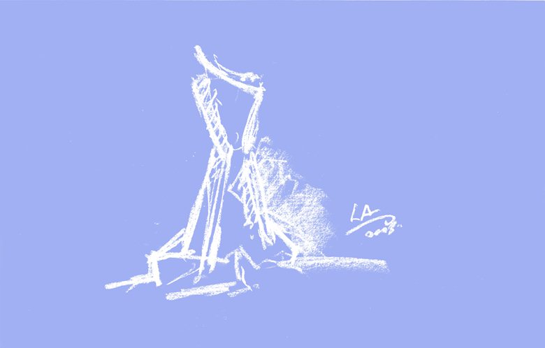 La torre parte dal suolo, si fonde con il basamento, si innalza e si rastrema dolcemente lungo le facciate nord e sud, mentre le facciate est e ovest restano completamente verticali. Una sola parte della torre è leggermente inclinata. Questa è la caratteristica essenziale della composizione. Questa variazione, in aggiunta alla forma conica, crea viste della torre di volta in volta diverse nello skyline.