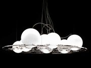 In questa edizione di Euroluce 2009, il lampadario è, tra le diverse tipologie di apparecchi luminosi, sicuramente la più studiata. Vari i modi di affrontare questo tema: il lampadario scultura, il lampadario ludico, il lampadario citazione. Antonia Astori e Nicola De Ponti inaugurano, per O luce, un approccio del tutto nuovo: nelle loro mani il lampadario diviene “sistema”. Un vassoio (“Plateau” è il suo nome) di metacrilato trasparente, regolarmente forato, ospita globi di vetro opalino posizionati in modo casuale. I numerosi fili elettrici, elemento usualmente non considerato in chiave progettuale, salendo verso l’alto creano un’aerea scultura e partecipano quindi al disegno dell’insieme. “Plateau”, disponibile in configurazioni circolari o ovali e in diverse dimensioni (dai 190 x 100 centimetri della soluzione più grande, a un diametro di 65 centimetri per la soluzione più piccola), si presta sia ad utilizzi domestici che contract. Trattandosi inoltre di “un sistema” può essere facilmente personalizzato dall’utente finale. Con “Plateau” il globo, da sempre elenco iconico del disegno della luce, trova una rinnovata vitalità e un’ estetica inedita.