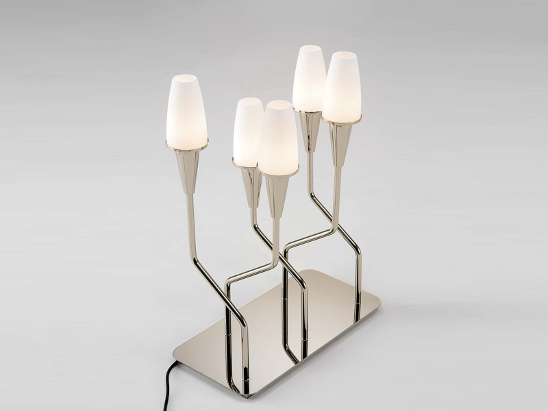 Benvenuta quindi a Gio, lampada che trae ispirazione dal design italiano degli anni '50, "uno chandelier moderno", caratterizzato da un unico elemento che sorregge le fonti luminose che, nella versione sospesa, corre lungo la struttura portante inseguendosi nello spazio; nella tavolo e terra subisce una esplosione, inserendosi nella base per dare forma ad una scultura.