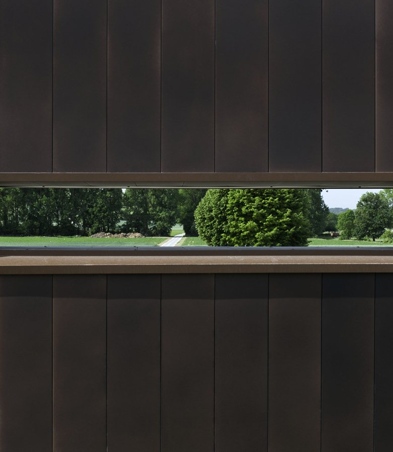 La facciata del museo è una lama in acciaio cor-ten che integra nel suo spessore la rampa, un muro di contenimento e la galleria espositiva del museo. Lo strato di ossidazione caratteristico dell’acciaio cor-ten protegge l’involucro e quindi l’edificio dall’umidità dell’aria e dalla corrosione.