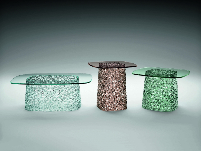 Macramè è una collezione di tavoli bassi, che nella sua struttura monomaterica riproduce il particolare merletto a nodi dal quale prende il nome. Il tavolino è composto da un basamento centrale che, come nell'antica arte del merletto “macramè”, è decorato da un filo continuo di vetro fuso adagiato a mano.