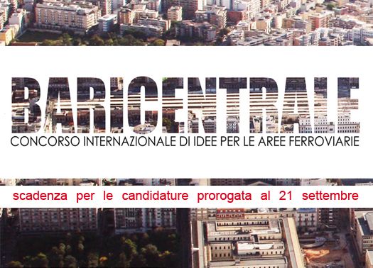 31/08/2012 - Il Comune di Bari ha deciso di prorogare di un mese la scadenza per l'invio delle candidature alla prima fase del concorso BARICENTRALE. Per presentare la propria candidatura ci sarà ancora tempo fino al 21 settembre 2012 (inizialmente era solo fino al 22 agosto).