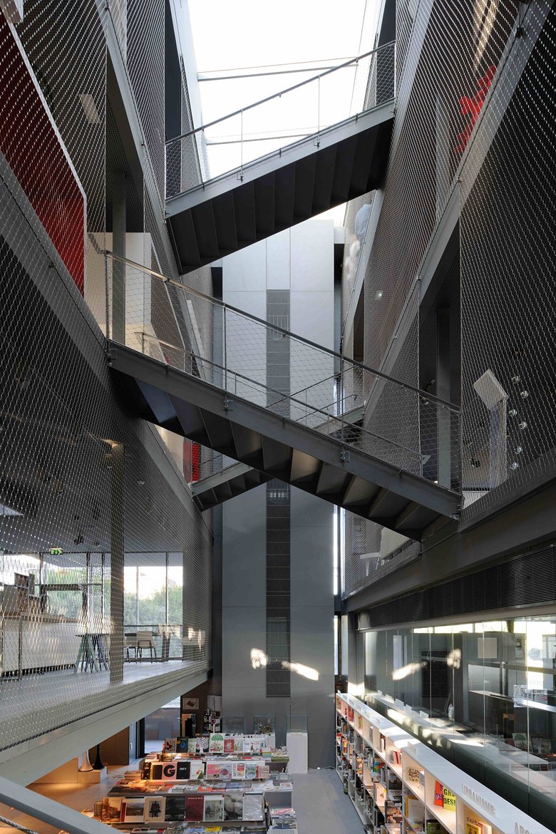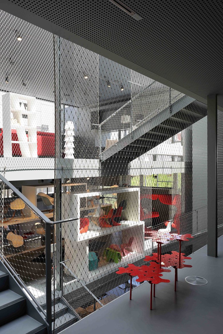 L'edificio, caratterizzato dalla marcata ricercatezza dei dettagli, è concepito come una 'macchina' per l'esposizione in grado di ospitare uno showroom su diversi livelli, ma anche una libreria ed un ristorante. Si tratta di un'opera d'architettura che già in facciata manifesta la configurazione interna degli spazi: un atrio centrale a tutt'altezza divide l'ambiente in due parti ed è attraversato da due scalinate metalliche.