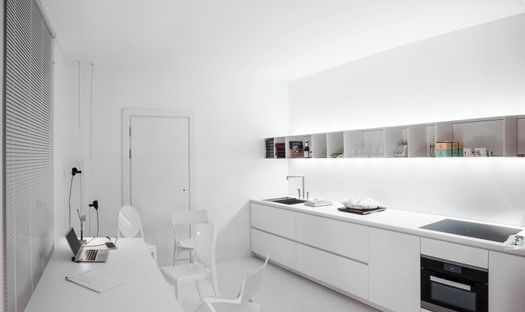 Al centro del SaloneUfficio è stato disposto un monolito attorno al quale si articolano cinque ambienti di lavoro differenti, dall’appartamento classico nel centro della città, al capannone industriale, allo spazio aperto, allo scenario high-tech a pianta aperta, fino al ricorrente ambiente domestico che si trasforma in ufficio.