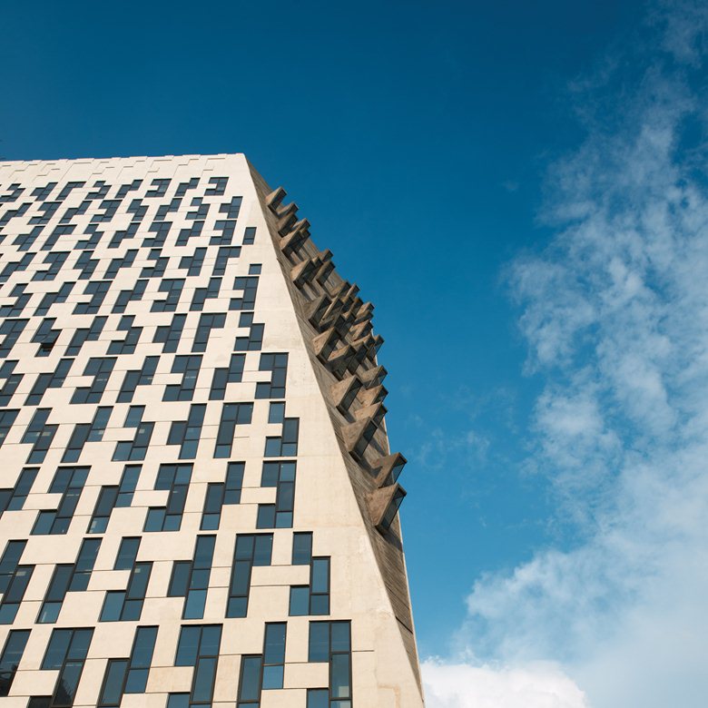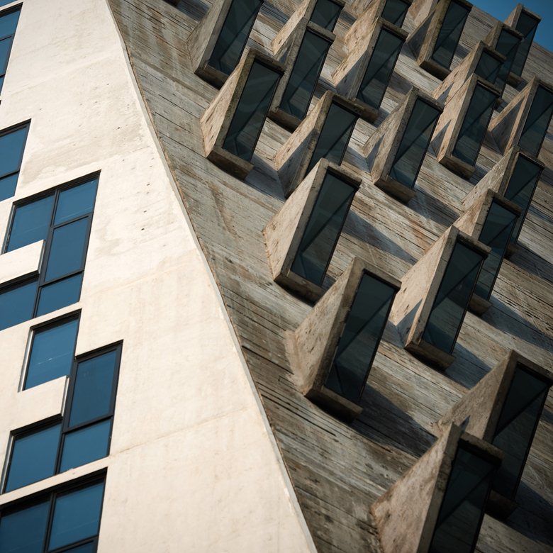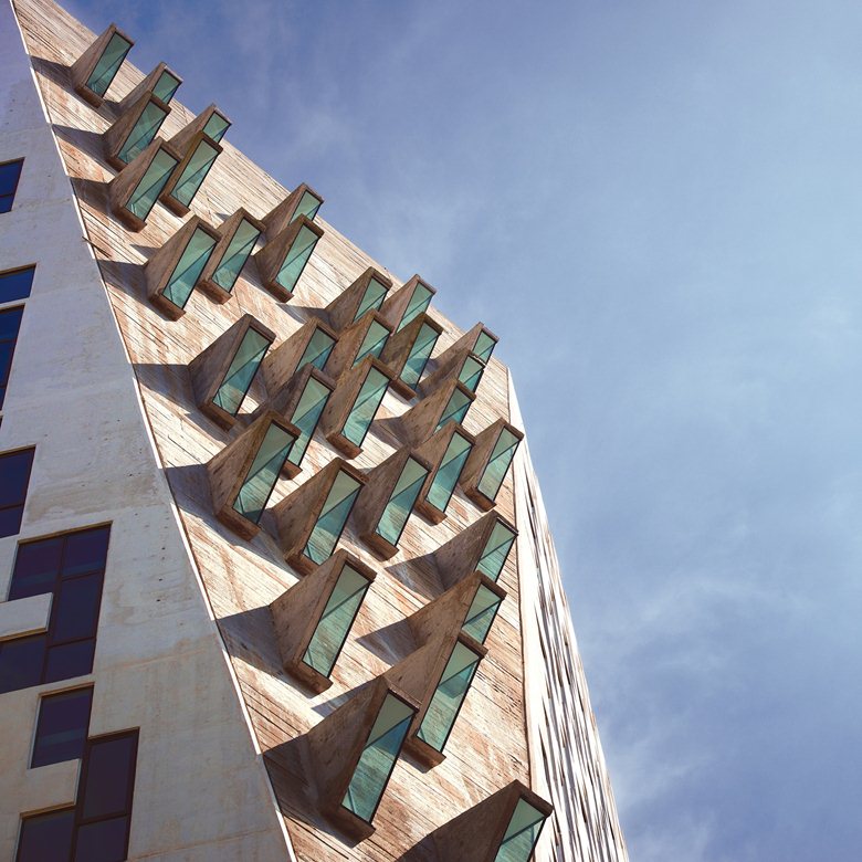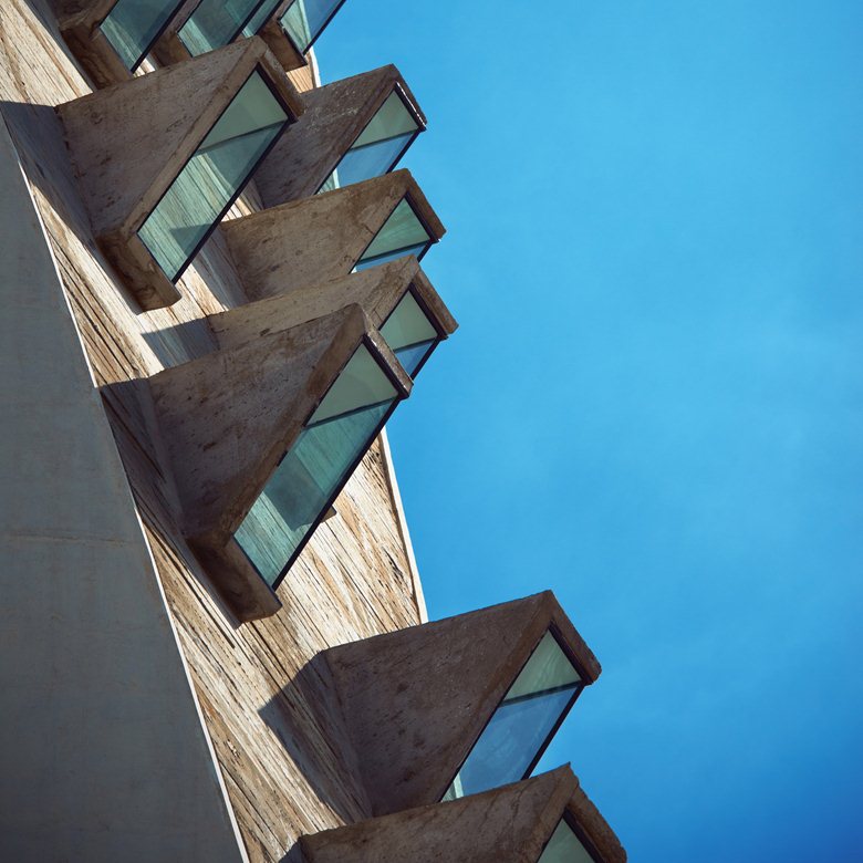 A caratterizzare il manufatto il disegno geometrico di facciata, definito dai ritagli delle aperture le cui forme  ricordano il noto gioco del 'tetris'; una porzione inclinata di una delle facciate si presenta, invece, ricoperta da una serie di aperture sporgenti, dalla sezione triangolare, che sembrano venir fuori dal calcestruzzo.